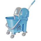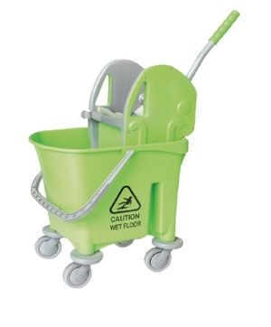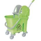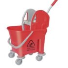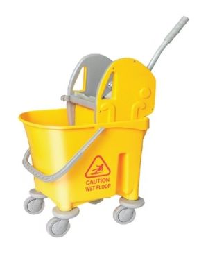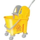This product is a commercial mop bucket with a down-press wringer mechanism and wheels for easy mobility. These types of buckets are generally unbranded or private-labeled by various manufacturers and distributors, making specific manufacturer details for this exact unit difficult to pinpoint. The visual search results indicate it is a widely available “Italy design” or “Kentucky style” model.